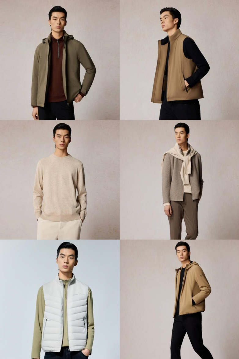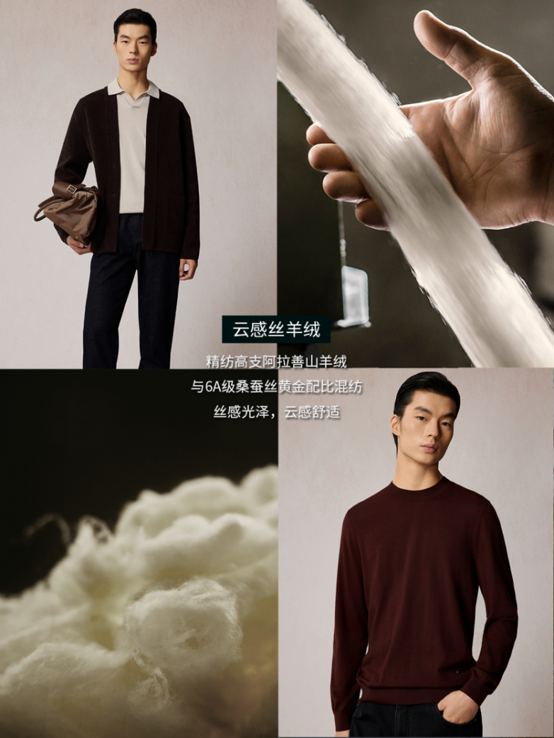 云感丝羊绒则进一步创新,将阿拉善羊绒与6A级桑蚕丝以黄金比例融合,并融入弹性纤维,打破传统羊绒的穿着局限。通过海鸥领、圆领、立领等多版型设计,实现“一衣多季、一衣多搭”的长期主义穿搭理念。这不仅是对资源的节约,更是对现代精英男士“少而精”生活方式的呼应。