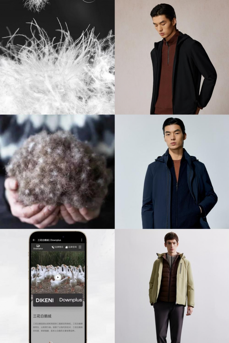 在羽绒品类中,DIKENI迪柯尼展现出对“人道与环保”的极致追求。冰岛雁鸭绒被誉为“羽绒界的宝石”,年产量仅3000公斤,每巢仅取12克野生绒,全人工采集,最大限度减少对自然生态的干扰。霍尔多巴吉白金鹅绒则源自匈牙利多瑙河畔生态养殖区,绒朵饱满、清洁度达1000mm,兼具蓬松度与低敏特性。“安心绒”更是品牌对可持续承诺的深化,采用进口抗菌技术和Sfresh羽绒专属水洗工艺,带来轻暖舒适体验,通过DOWN PLUS可追溯系统,让每一件羽绒服的温暖“有迹可循”。